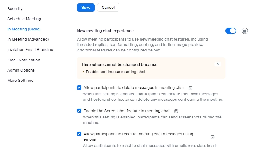 “Note: There is currently a known issue when using the new meeting chat experience, which causes chat messages to be lost when moving into breakout rooms. While Zoom develops a solution, we recommend those needing to utilize in-meeting chat and breakout rooms to disable the new meeting chat experience.