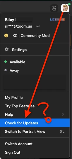 • To check for updates,  open your list of applications on your computer (Start menu for Windows, Applications folder for macOS), and find the Zoom.us app there. Once the app is open and you've signed-in, look for the Check for Updates option, as shown below: