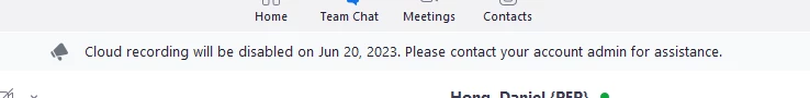 I can see this message in my profile from this morning ' Cloud recording will be disabled on Jun 20, 2023. Please contact your account admin for assistance.'