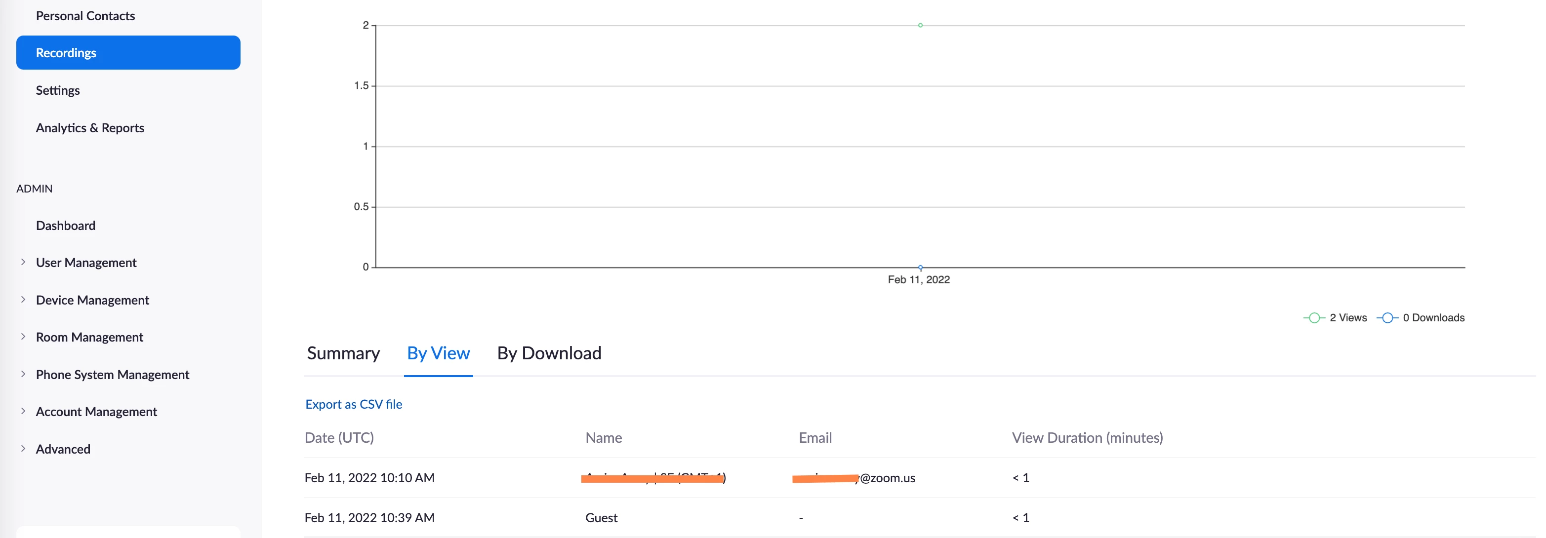If If a Zoom user is signed in to their account on the web and views or downloads the recording, the views column (Recording > Choose the recording file > recording Analytics > By View Tab at the bottom) displays their profile name and associated email address. ---> check attached screenshot