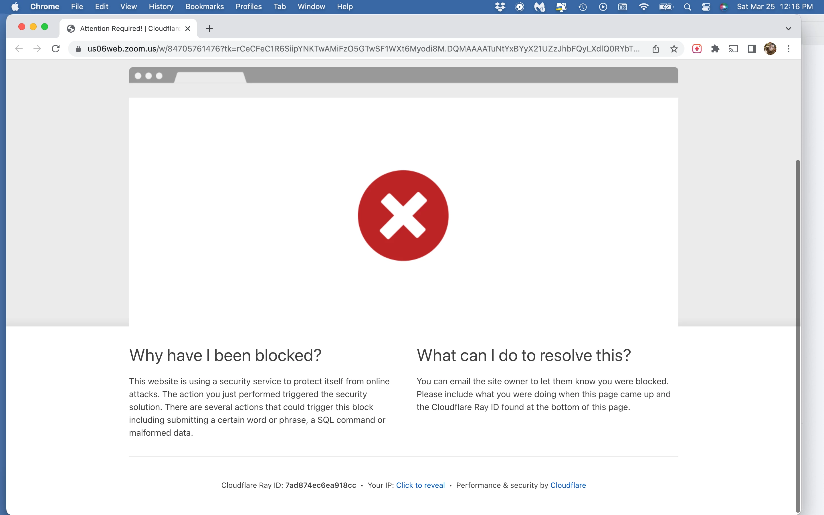 Greetings -- I have been receiving error messages from Cloudflare when I try to access Zoom from links I receive stating that I am being blocked.  The group sending the link has no idea why I would be blocked.  Has anyone else had this happen?