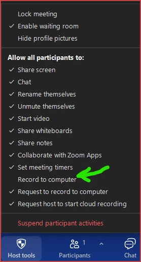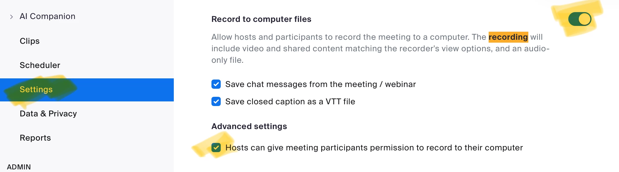 Does anyone know if there is a way to configure my Zoom account so my clients can automatically choose to record THEIR Zoom sessions with me to THEIR Zoom account cloud or on their computer hard drive---not mine acct? I no longer wish to record my sessions on my Zoom account and be responsible for sending their recording link---ever---and want clients to have immediate permission to click record and have the recording land in their zoom account or hard drive by default. Thank you!