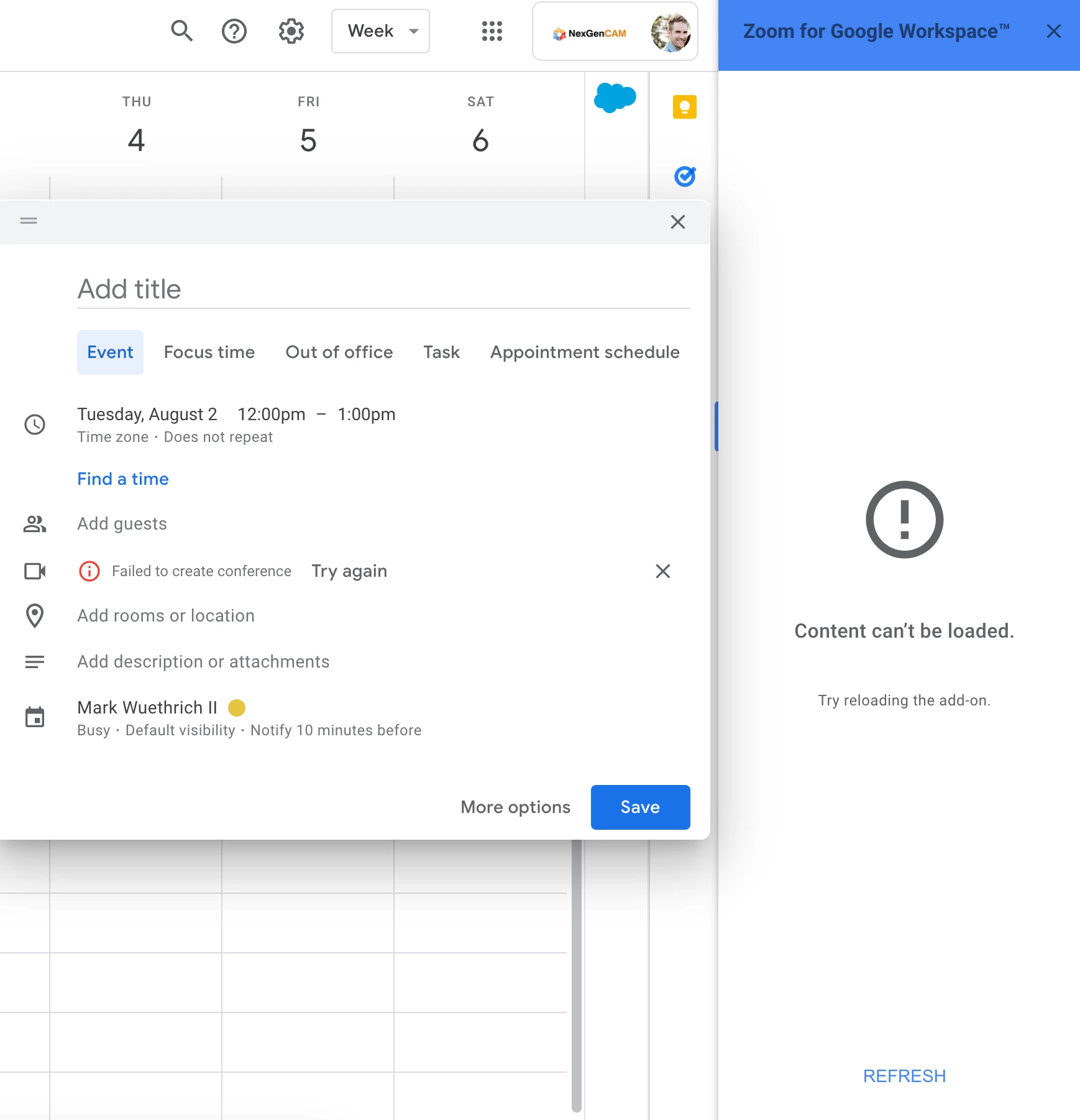 "Failed to create conference" error message in the Calendar Event and when I click the Zoom button on the right side of the page I get a "Content can't be loaded try reloading the add-on" message.
