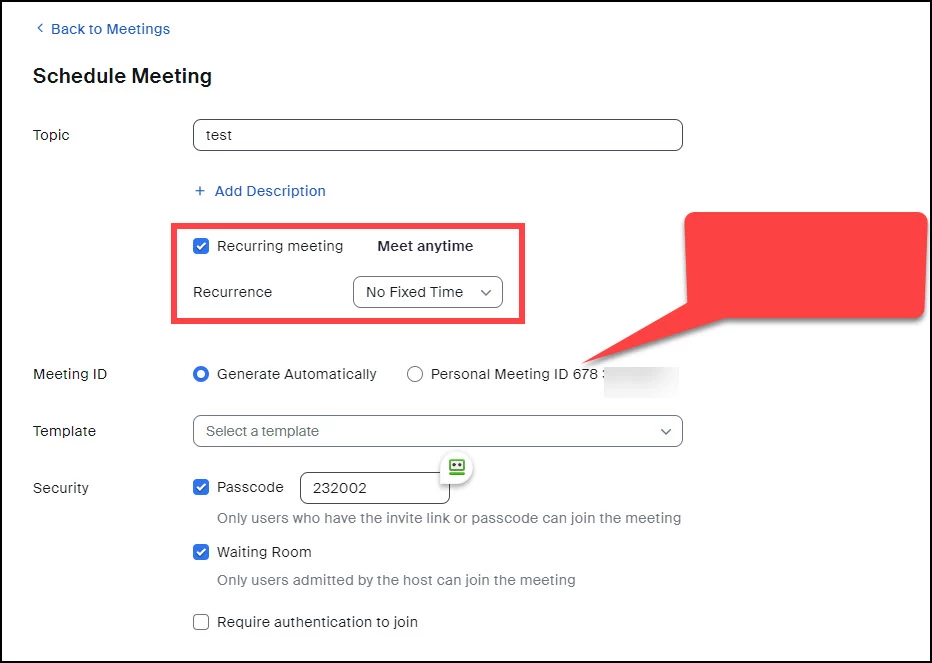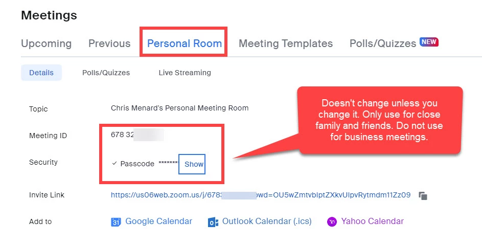 Now, a recurring meeting with no fixed time can be set up to use your Personal Meeting ID. I don't recommend you do that. Let the number be generated automatically. You still could have the same issue with users joining when you don't expect it, but this one is easier to change. In fact, I have a recurring meeting, but I change it every three months. You can even have multiple recurring meetings with no fixed time, but you can only have 1 Personal Meeting Room. You could have a recurring meeting for client A and a different recurring meeting for client B.