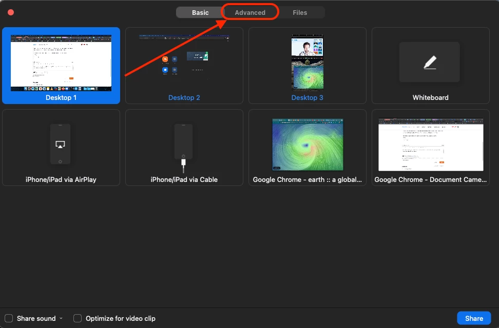 I am trying to share a second camera I do not see the option under advanced sharing. I can switch between the cameras under video, so I know zoom recognizes the camera All I see under advanced sharing is: