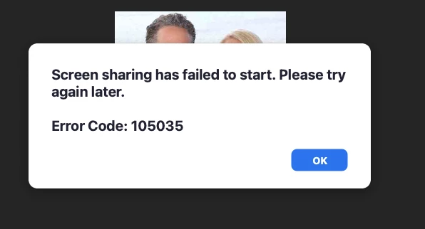 AActiveTeamPartnerForum|Forum|2 years agoAugust 14, 2023QuestionDoes anyone having issue sharing their screen Error Code: 105035Forum|Forum|2 years agoAugust 14, 20230 replies1 viewDoes anyone having issue sharing their screen Error Code: 105035I have recently installed macOS Ventura 13.5, since and updated Zoom to the latest Vision I am receiving this error message attached! Any feedback from anyone?Screen sharing