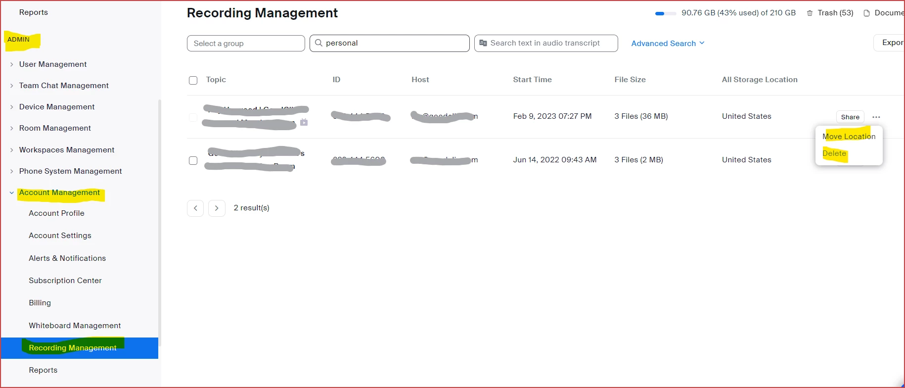 I think you are looking in the Admin -> Account Management -> Recording Management area: