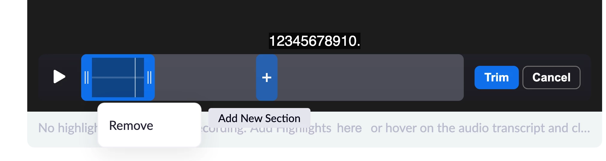 To delete a section of the trim, hover over a trim (blue section of the recording playback bar), then click Remove.