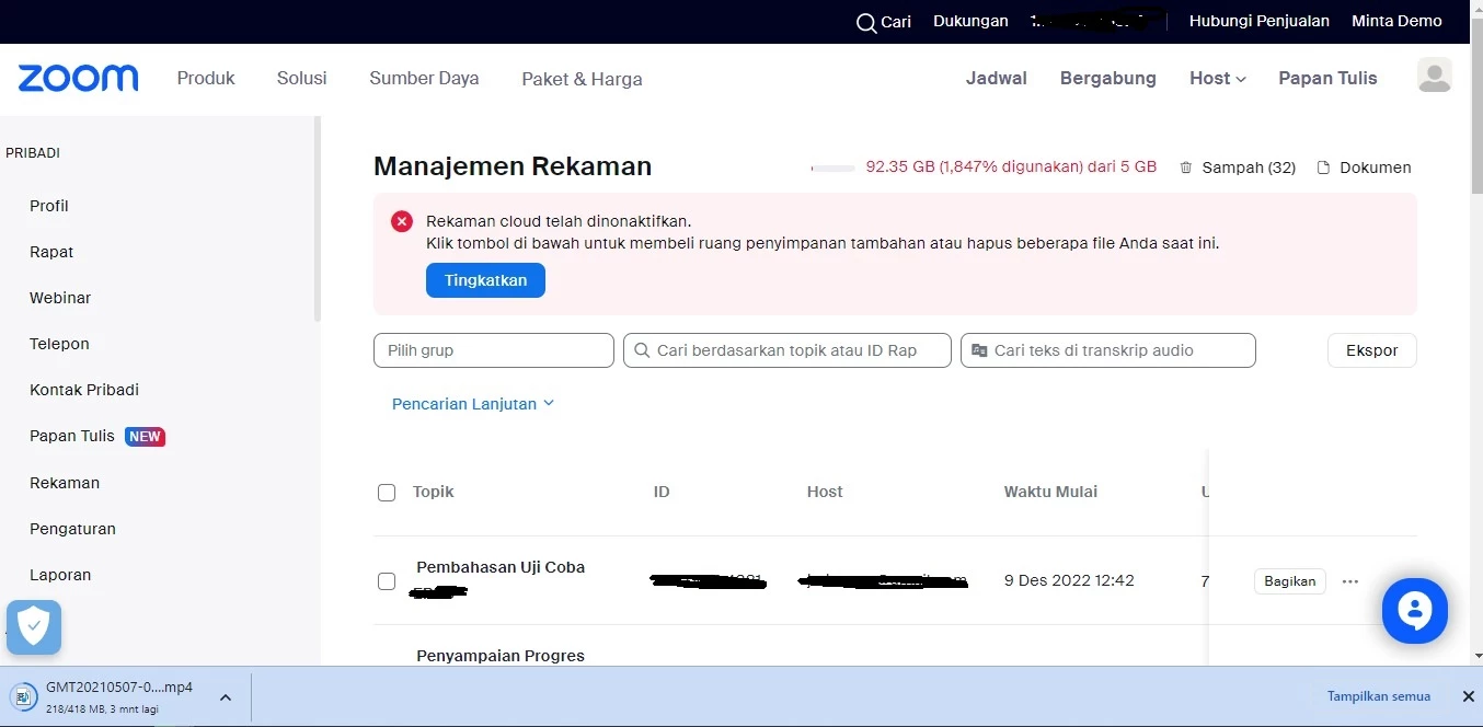 DditewwNewcomerForum|Forum|3 years agoFebruary 21, 2023QuestionEnabling Cloud RecordingForum|Forum|3 years agoFebruary 21, 20231 reply2 viewsHi, i couldnt record the meeting because the cloud is full, today i delete some of recordings and the notifications still pop out like this. Any suggest?