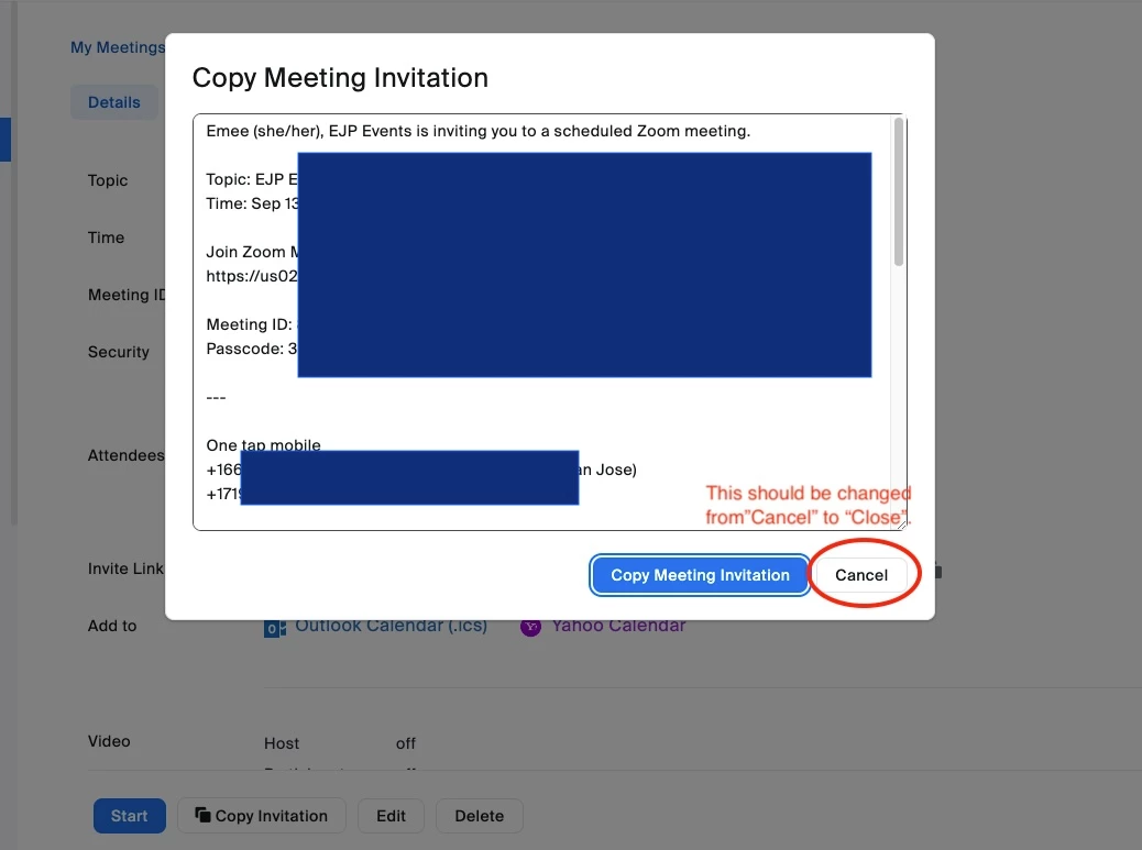 Feature Request: Change button that closes "Copy Meeting Invitation" from "Cancel" to "Close"