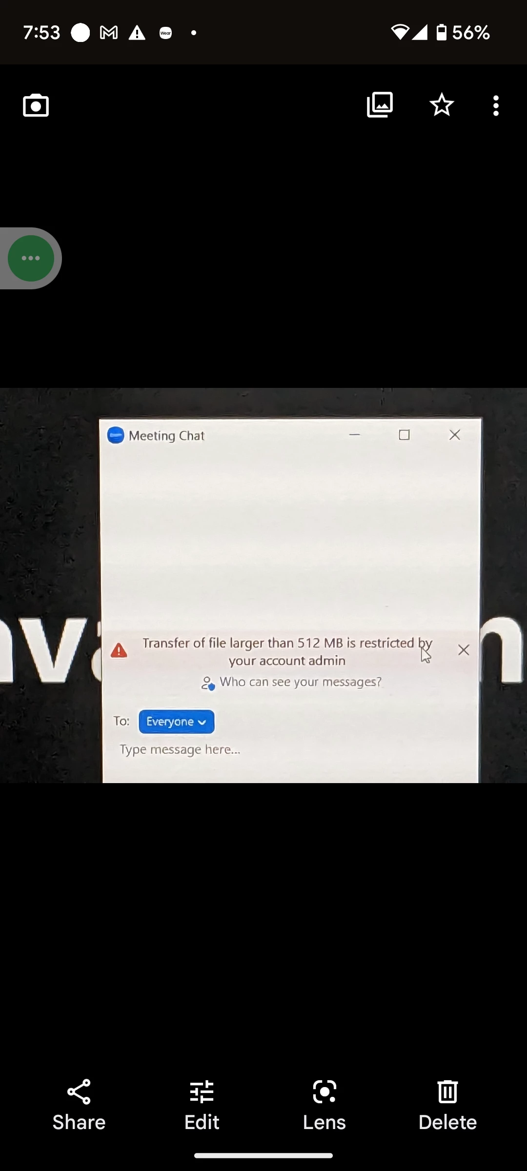 I used to be able to upload videos larger than 512 MB in the chat box of a zoom meeting to transfer to someone. As of last week, I am now limited by my "account admin" to files 512 MB or smaller. I have a Pro zoom account. Under account management/account settings/In Meeting (Basic), the only options under "Send files via meeting chat" are to 1) only allow specified file types or 2) set a maximum file size.