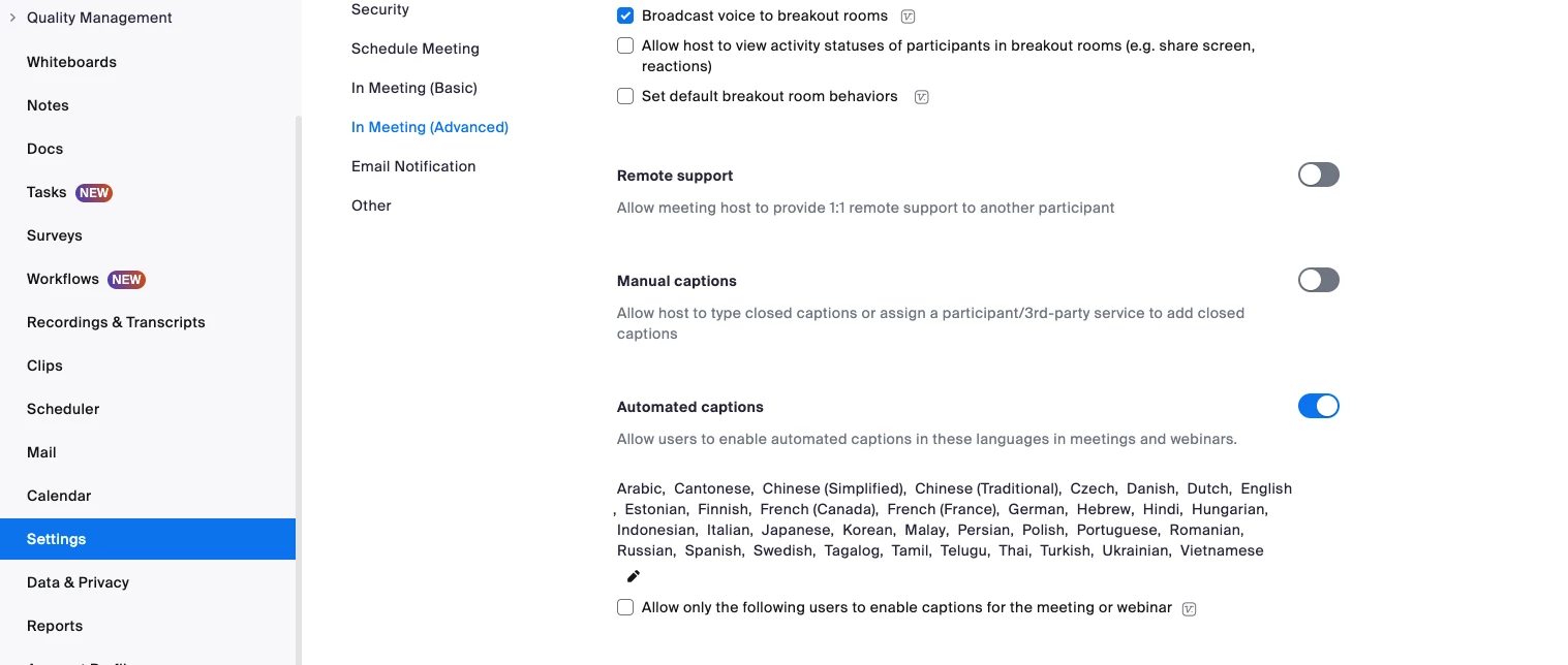 To add captions, go to your settings tab on the left hand side and then choose "In Meeting (Advanced) and then navigate down to either manual captions or automated captions and then toggle on which one you would like to utilize.