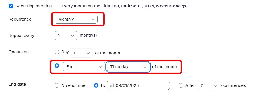 Can I set a recurring meeting...only for to "the first two" Thursdays of every month?