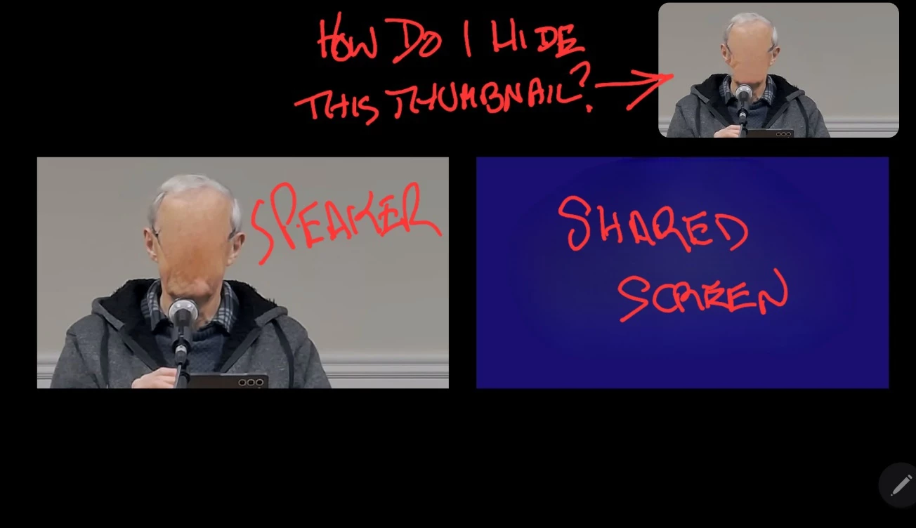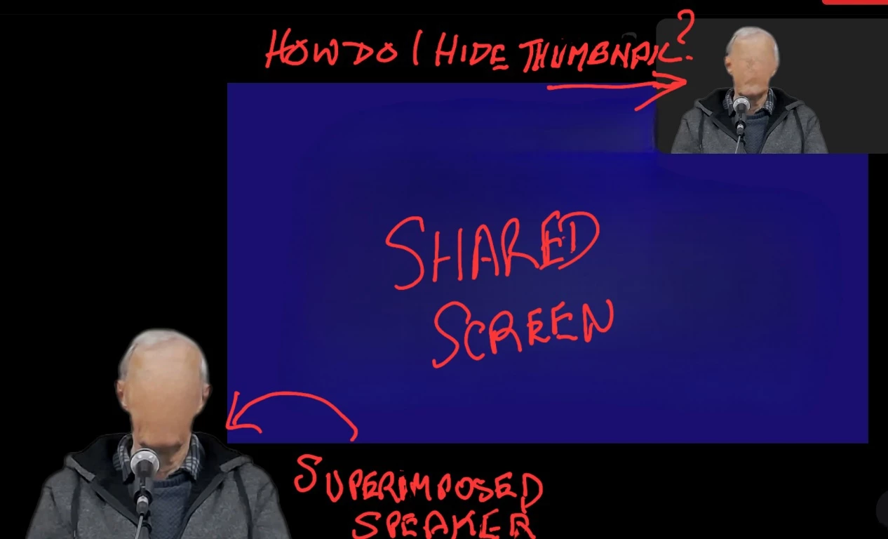How do I hide the speaker's thumbnail image from those attending the meeting, while sharing a image or video etc? This is especially needed when using the share screen alongside the speaker two images side by side) or when the speaker is superimposed onto the shared image. In these share modes there is still a floating thumbnail of the speaker on a mobile device or they appear at the top of the screen along with other participants. It looks silly having two views of the same speaker.