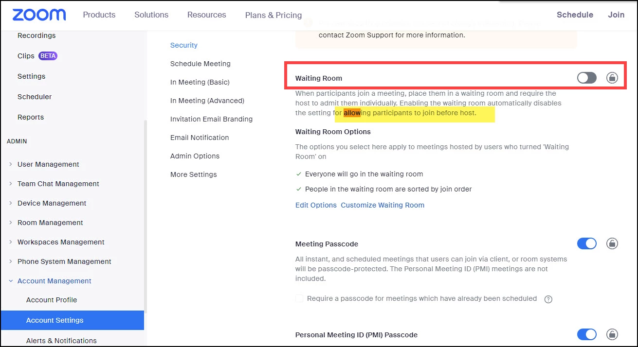 Now, when you schedule a meeting, make sure you don't check Waiting Room. You must select one of the three security settings. I tested with Passcode checked, and nothing else, and it worked.