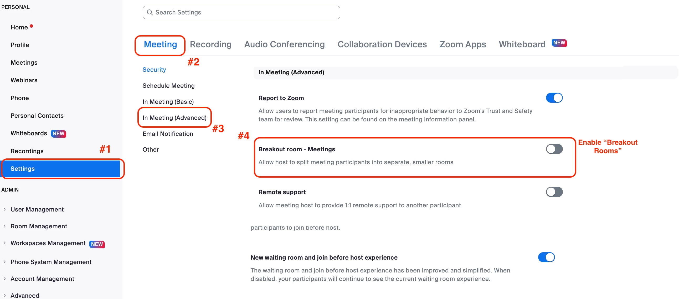 Thanks, but I don't see the meeting tab under In Meeting (Advanced) to click the Breakout room toggle to enable it.