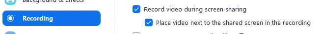 2. Even though people sharing the screen cannot switch to side-by-side mode, they can still capture local recordings that display the shared screen and video side-by-side. Don't forget to check these two boxes in the settings of the Zoom desktop client if you want this to apply.