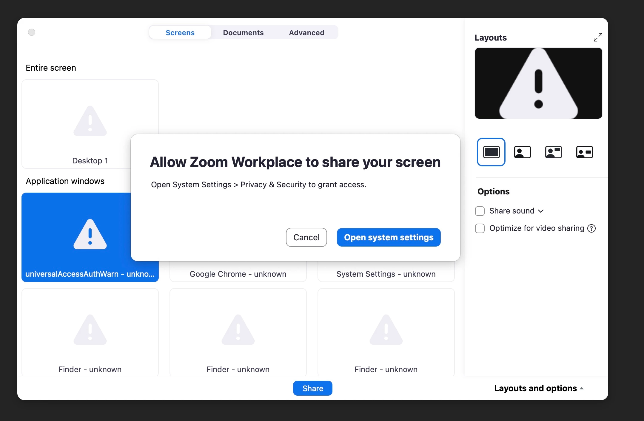 I am on a Macbook Air I bought two weeks ago. Since seamless porting over my data to the new computer, Zoom won't let me share my screen. When I click the Share button, the tab picker pops up as normal but I can't see any of my tabs in the tab icons. I see generic icons as in the attachment. If I click on one of these generic icons, I get the alert (in another attached pic) that says I have to go to Privacy and Settings. But it doesn't tell me what I am supposed to do when I get there.