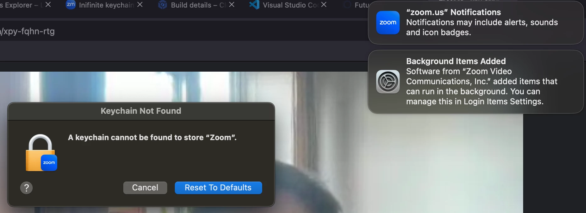 6. Giving up on uninstalling zoom, manually opening 'keychain access' on mac and deleting all keychains with 'zoom' in the name- got the keychain error popup about an hour later.