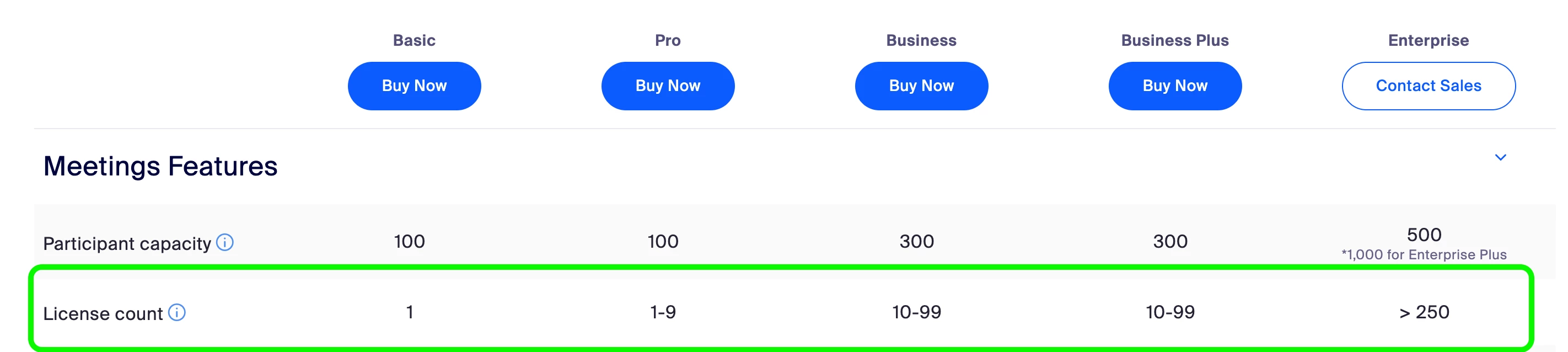 I cant finde the info on how many Licensed user i can have in diferent palns types, how many users that can start a meeting per plan type?