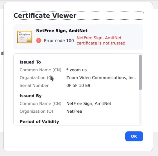 I installed the flatpak version of Zoom, and the certificate is not recognized.
