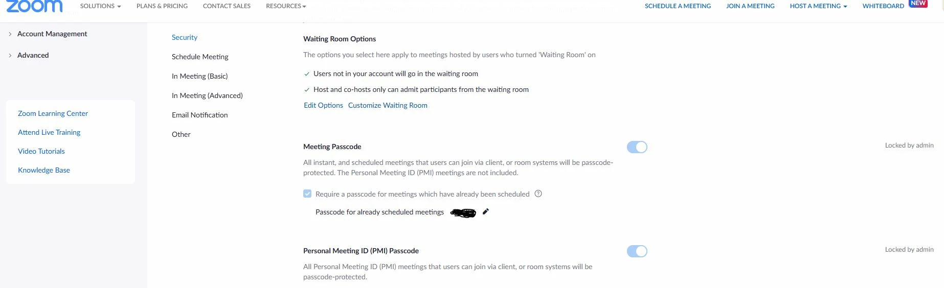 there are settings that are "Locked by Admin" which I cannot toggle on/off (greyed out) such as Meeting Passcode & Personal Meeting ID Passcode. I thought as Owner I had all the privileges of Admin & more. How can I get to toggle those settings (see attachment)