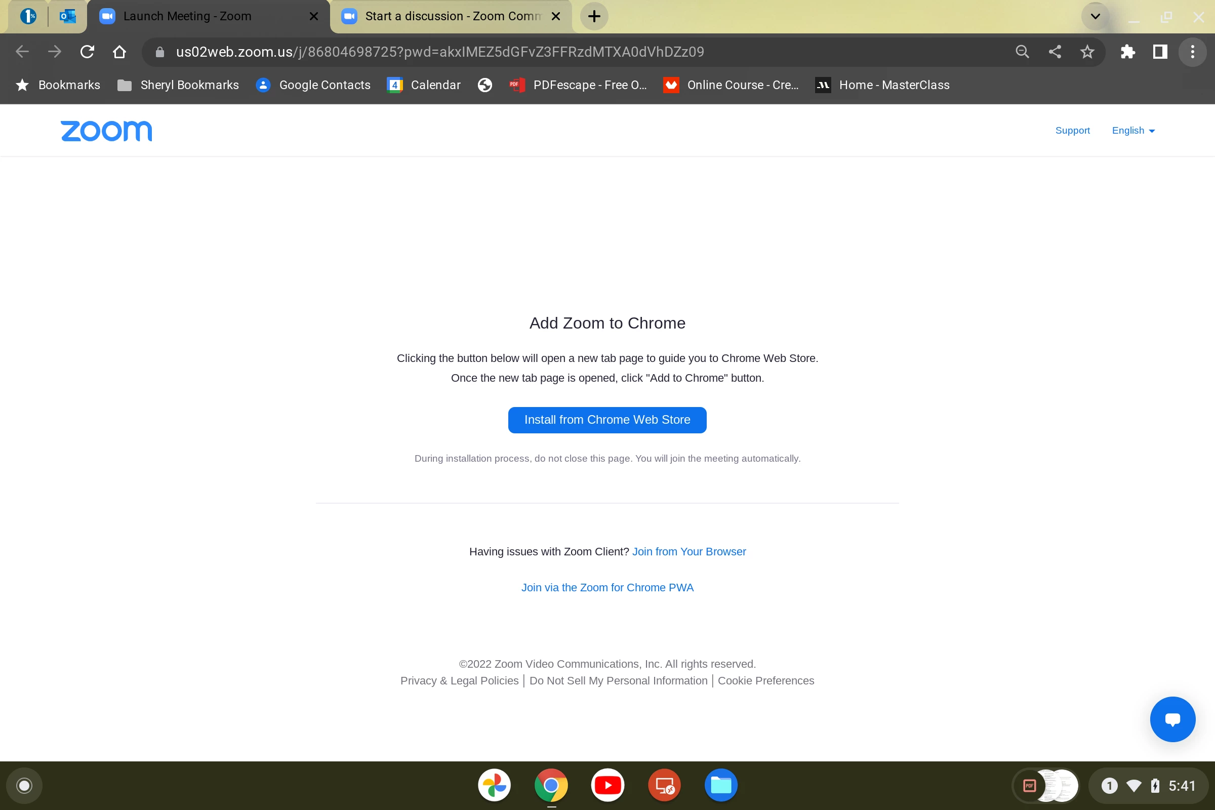 Hi - whenever I screen share (joining Zoom from my Chrome browser) the microphone access is not activated when I screen share. This seems to be a relatively new issue. I've also had the same issue when I've tried to use Chrome from the web store (see image below). I haven't tried joining via the Zoom for Chrome PWA.
