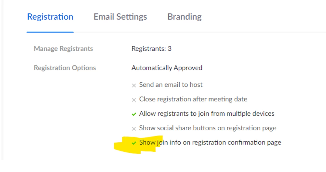 Zoom recently changed the Registration Confirmation flow and added the configuration option "Show join info on registration confirmation page".