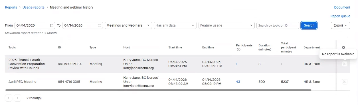 One of our enterprise premier users has encountered an issue with generating Zoom logs for their two recent meetings that took place on April 14th. In the provided Screenshot, the user has two meetings. But she cannot generate reports using the icons on the right side. I as an administration have tried to generate the reports for her as well, but the Report icon is greyed out for these and all other meetings for our tenet.