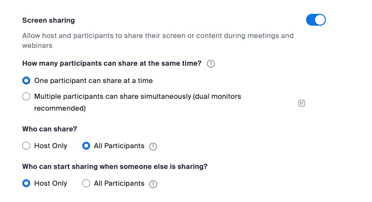 As for allowing anyone to share their screen at any time in the meeting, you would need to adjust the Screen Sharing option on the Setting page in the web portal.