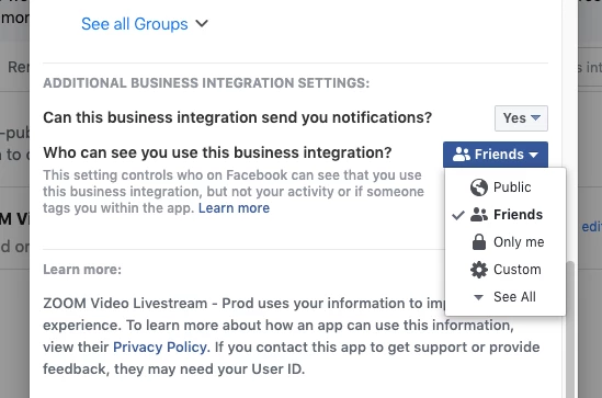 I removed the app on my business integrations.  i went back through trying to access facebook via zoom.  instead of giving permissions to the 1000+ groups i am part of, i only provided permissions to the groups i am an admin for in case that was it.  I also tried once with the default permission in the attached photo of "friends" and once with "public".   Same permissions error.