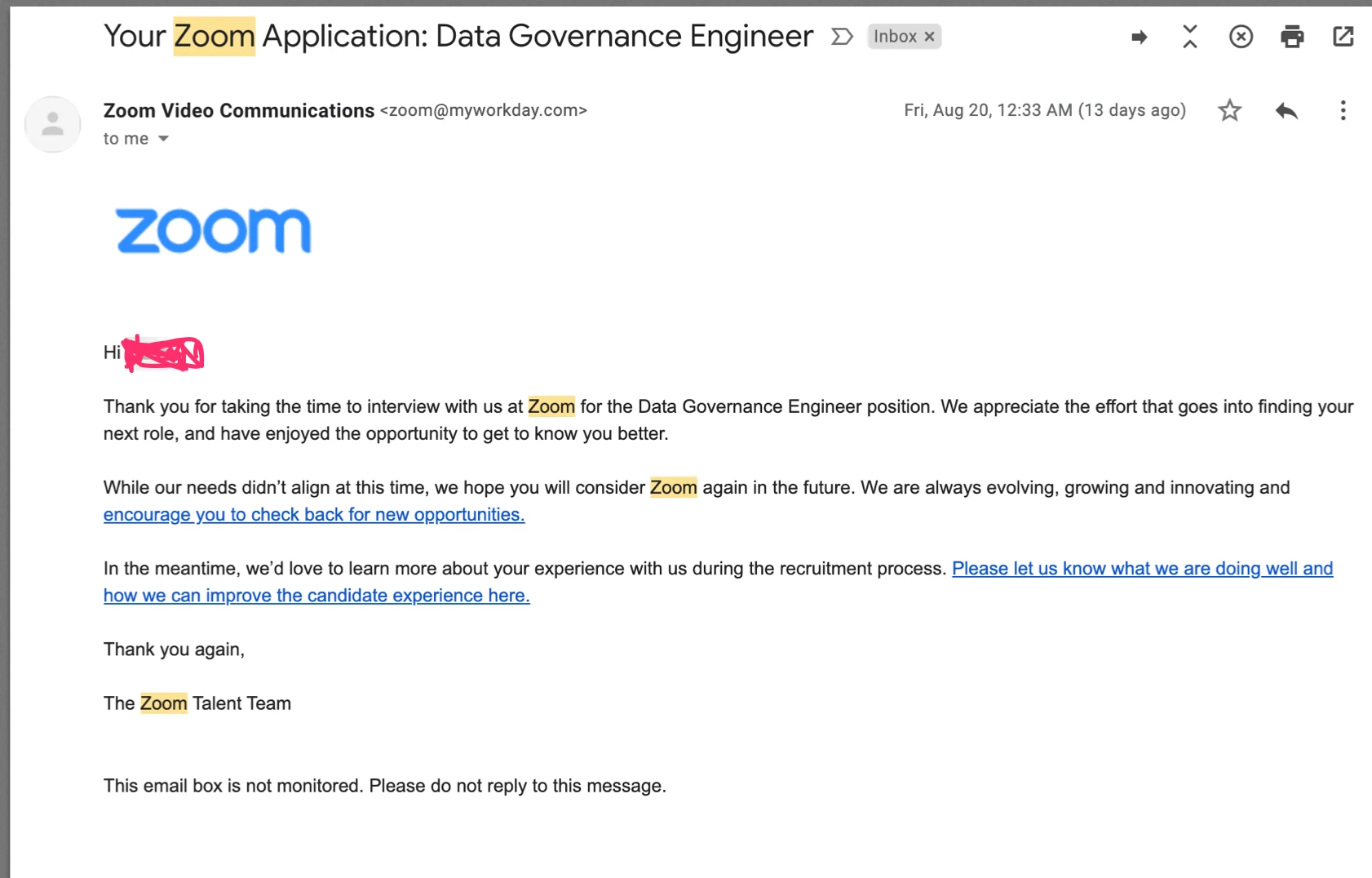 Received an email from Zoom about recent job interview. Identity theft or privacy breach on Zoom?