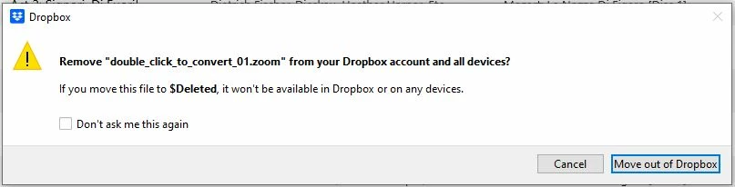 Finished recording a meeting locally and waited for the recording to convert. Then got a pop-up message saying Remove "double_click_to_convert_01.zoom" from your Dropbox account and all devices? If you move this file to $Deleted, it won't be available in Dropbox or on any devices. The choices are "Cancel" or "Move out of Dropbox".