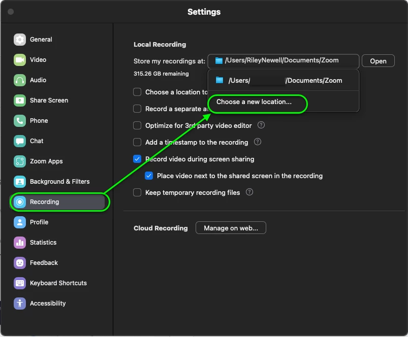 Hey @felipe_aidar, if you go into your Zoom desktop client settings under Recording, you can click anywhere in the box where the location of the recording is being saved and you will have the option to Choose a new location... From there you can choose the new location for your local recordings.