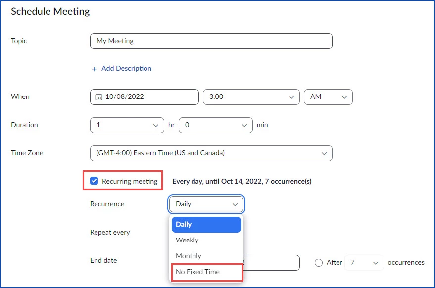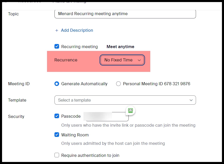 I've been using recurring meetings- meet anytime for 1:1 meetings that occur randomly through the week. Today I tried to schedule a new one, but the function for "meet anytime" is gone. Support article says it should be listed under the "recurrence" drop down, but I don't see it there. It seems like it was forcing me to put in a specified date and time for recurring meetings, which really just doesn't work for what I need.