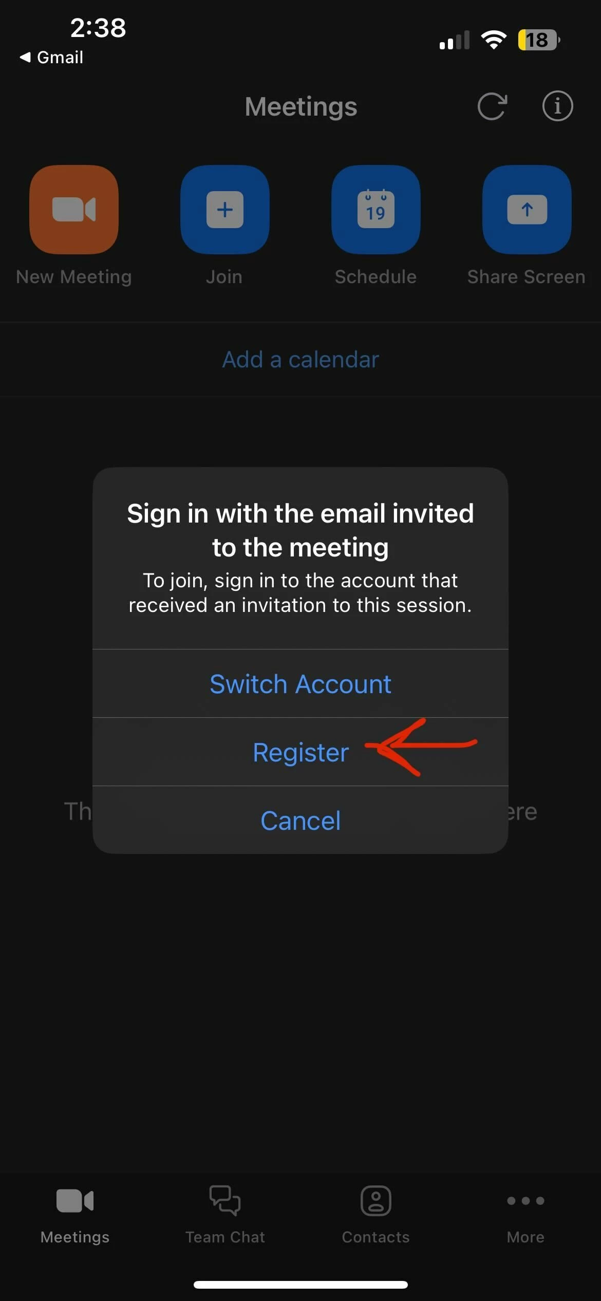 I remember the invite link only letting people choose from one of two options: sign-in with the registered email or to cancel/leave the meeting