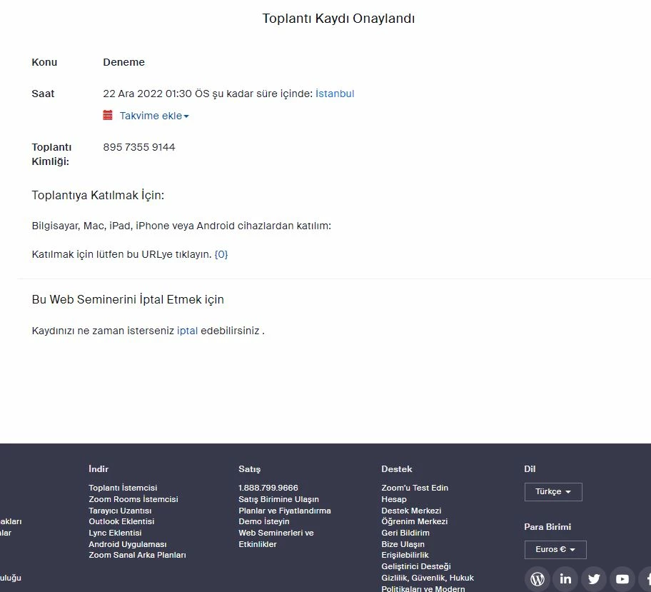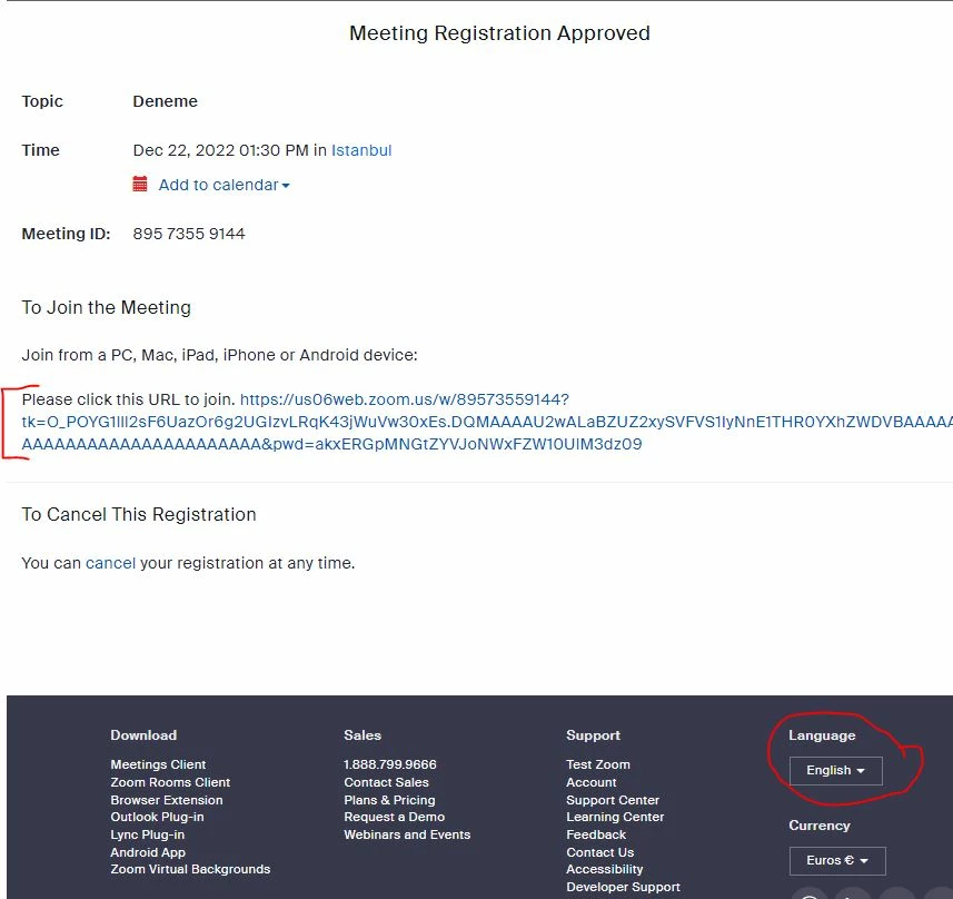 Hi, I have activated Registration required for a meeting. When the participant has the browser to view in Turkish language, and they register for the meeting; the URL link appearing on the Confirmation page to connect appears as {0}. (Attached pic 1). When you click on the link it goes to error page in Turkish (attached pic 2). But when the participant toggles browser to English language, the functioning meeting URL appears (attached pic 3). When toggled back to Turkish again turns to {0}.