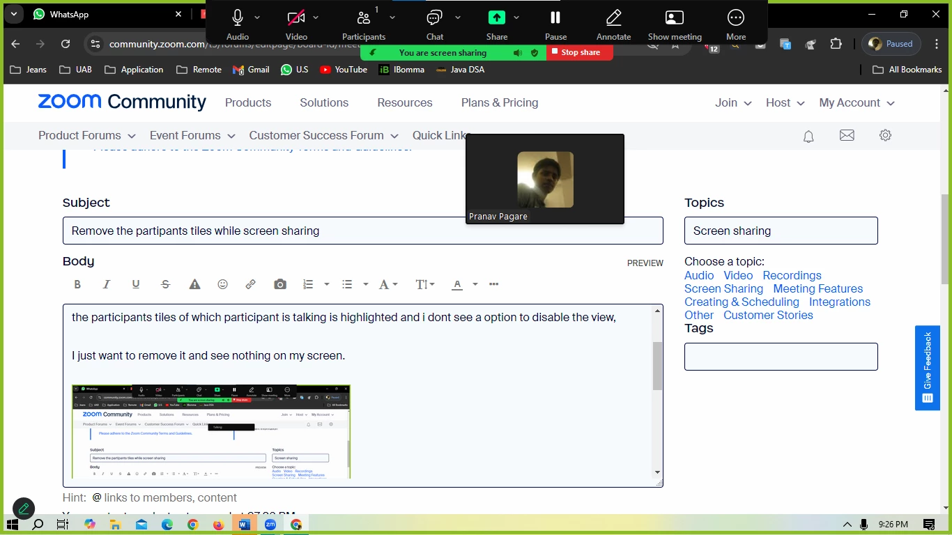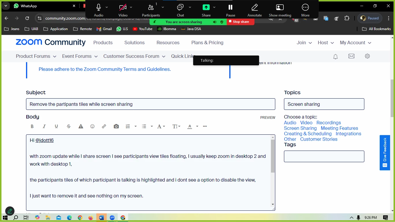with zoom update while I share screen I see participants view tiles floating, I usually keep zoom in desktop 2 and work with desktop 1,