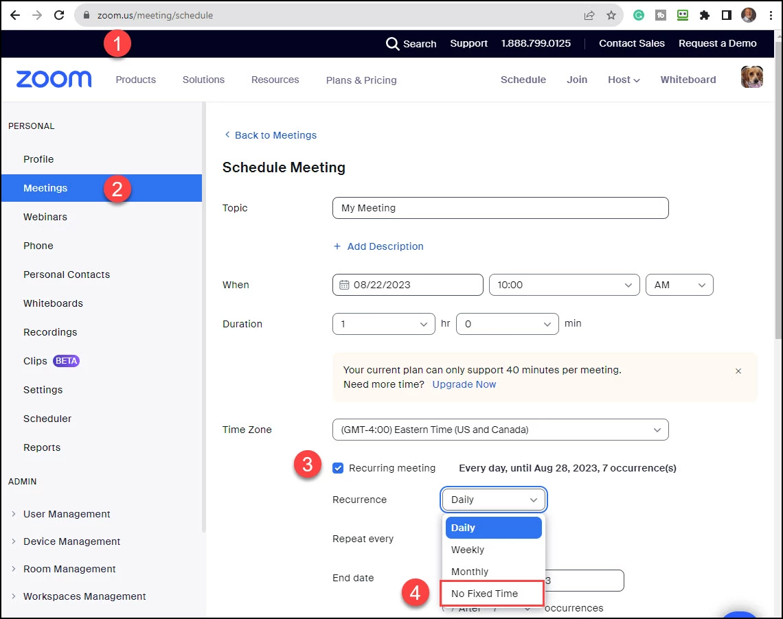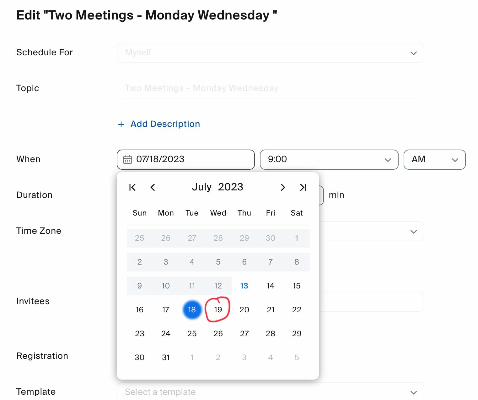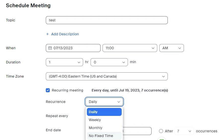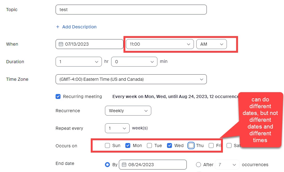 I do private tutoring through zoom. I have a student who wants to take a class Monday morning and then Wednesday night. How do I create a reoccuring meeting with the same meeting ID, but on different days and times?