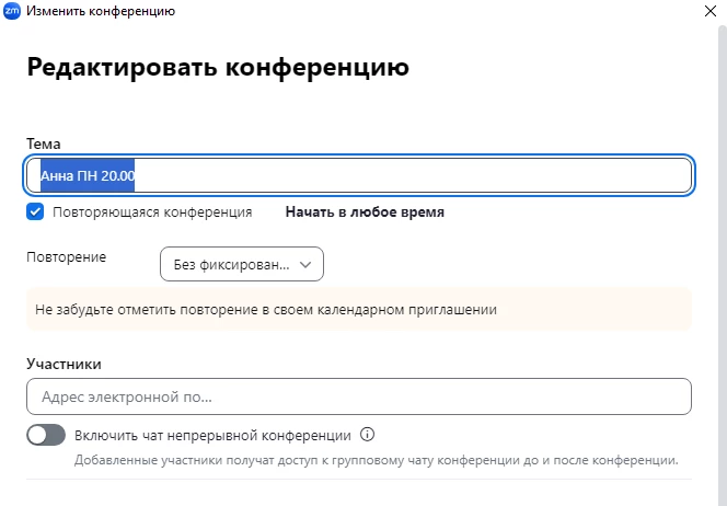 Hello! I make permanent conferences for my clients (as a psychologist i have one meeting a week with one of 20 persons and every person has its own conference with me). During previous 2 years it looked like this.