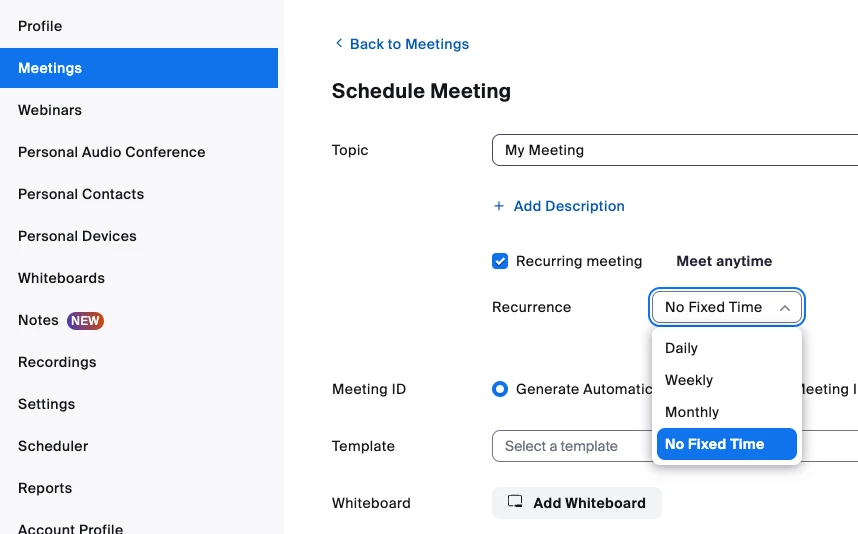 Zoom allows you to schedule meetings with multiple occurrences so that each occurrence uses the same meeting ID and settings. You can schedule these meetings in daily, weekly, and monthly increments. You can also set a recurring meeting to be used at any time.