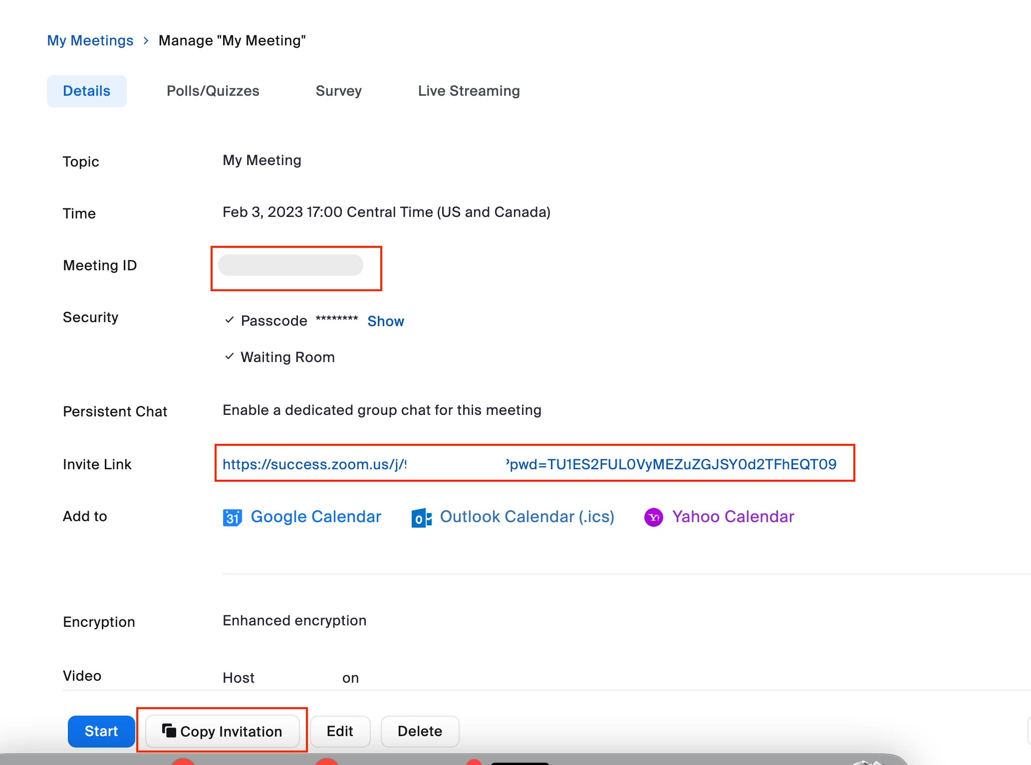 To invite or get meeting details for the attendees you can click into the meeting you're hosting and you can either copy the invitation, copy the invite link, or meeting ID and password.