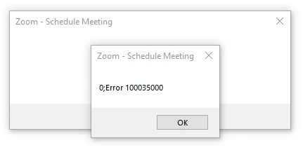 I am a Zoom admin and have an end-user who receives Error 100035000 when attempting to schedule a Zoom meeting (see attached). I have looked online and found very little about this particular error so any and all feedback would be greatly appreciated.