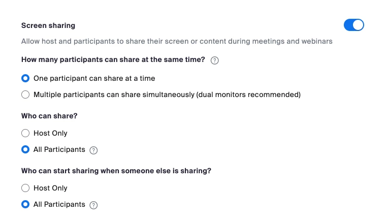 I need my calls to have a pre-setting so that in all of my calls multiple users have permission to share their screen by default. (without needing my authorization during the call). Any ideas?