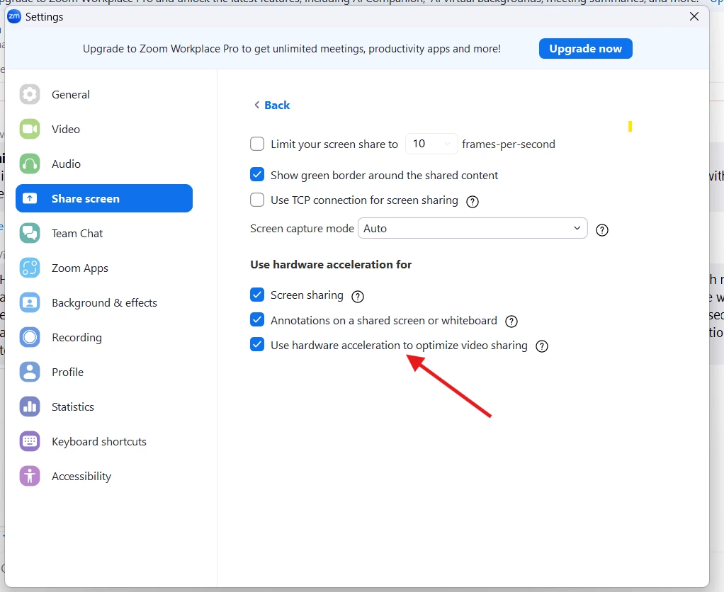 Within the Zoom application, access the Settings menu, then select Share Screen and click on Advanced. Here, you'll find the option for Hardware acceleration for screen sharing. Try toggling this setting, either enabling or disabling it, to see if it resolves the problem