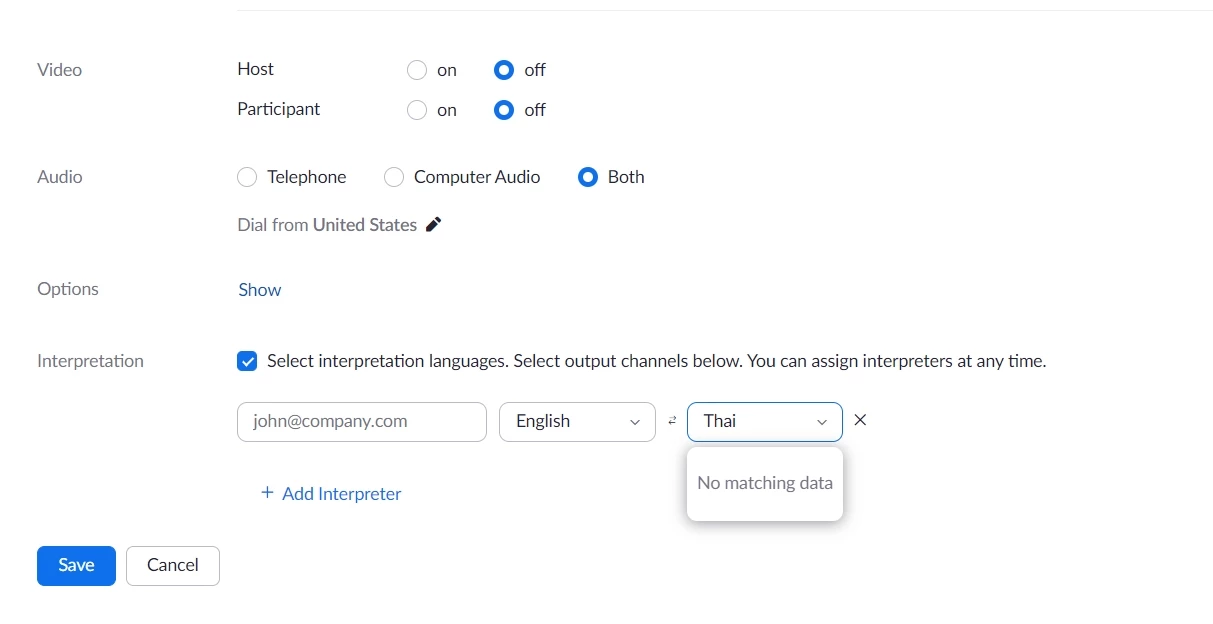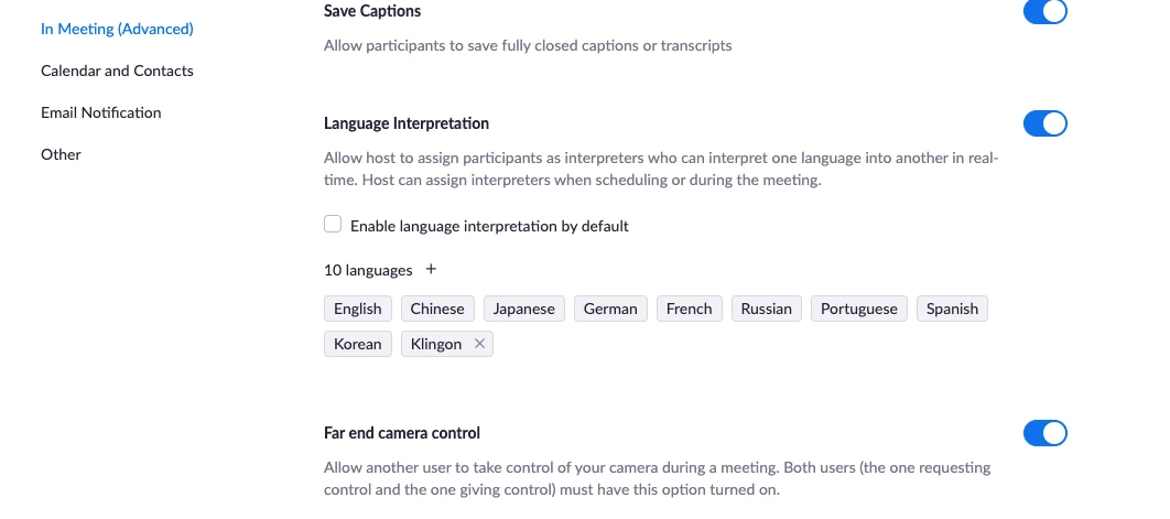 Selecting languages for interpreter services on Zoom