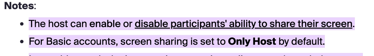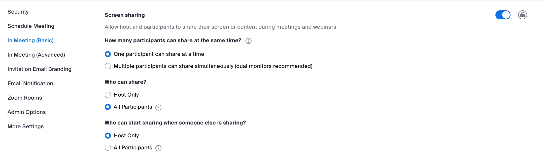 I have no problems sharing my screen during a meeting but have not been able to enable others to share their screens during the meeting. I am the host and have looked at all the settings but some are greyed out. There is probably a simple answer but I cannot find it.