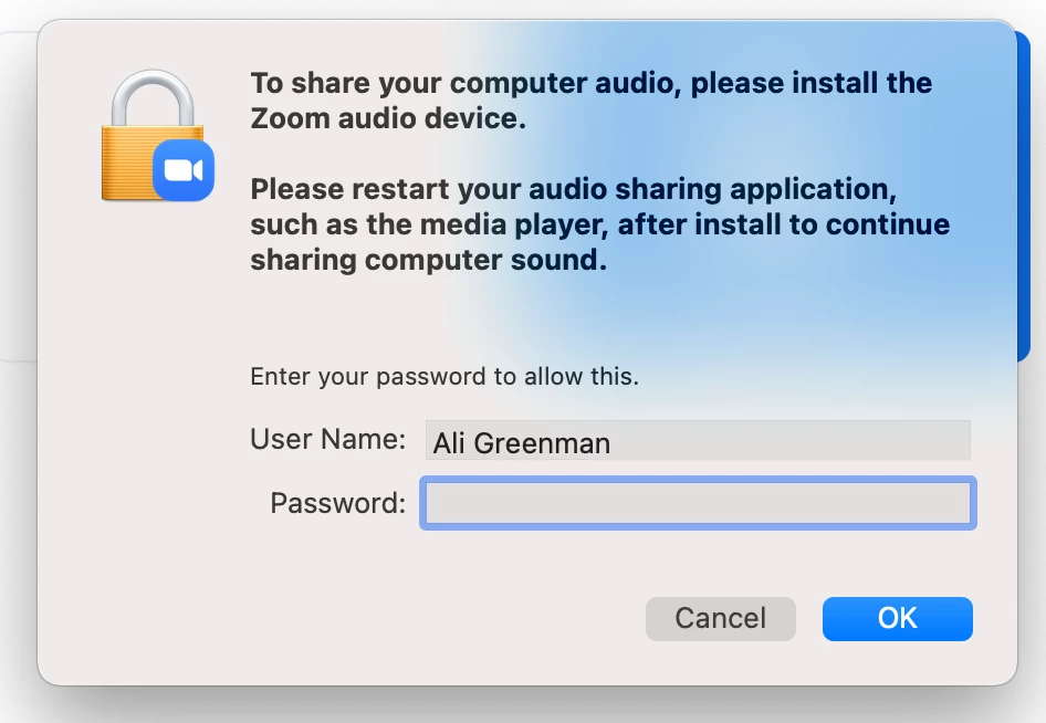 I share my computer audio quite frequently, and about 9/10 times, it works just fine. However, sometimes I get this "To share your computer audio, please install the zoom audio device" message, asking for my username and password. If I click cancel, it shows that I'm sharing my computer sound, but participants can't hear what I'm playing. If I enter my password, everything on my end goes silent. I can't hear my own audio that I'm playing, or anything from the participants, but they can hear my audio. It seems the only resolution is for me to enter my password, leave zoom, and come back in.