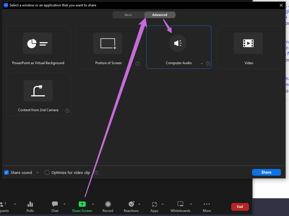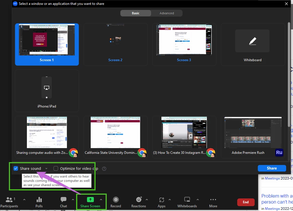 Sharing computer audio with Zoom meeting attendees while the host wears headphones.