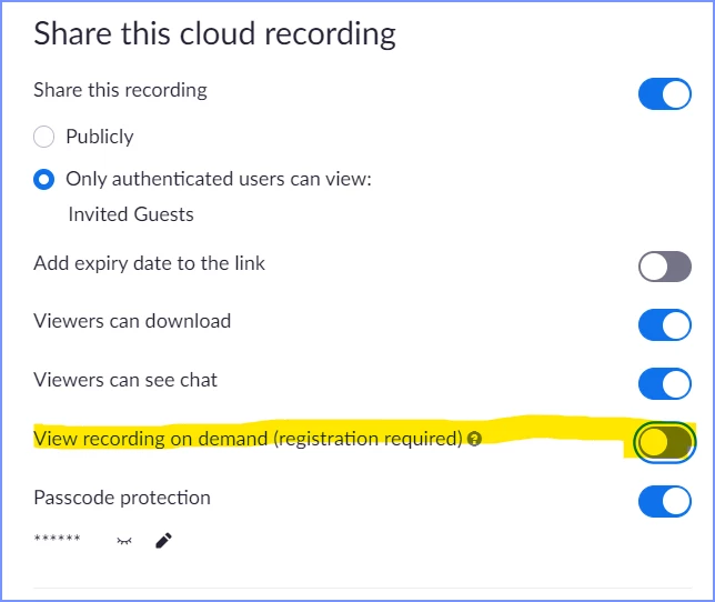 Poeple that I sent it to are telling me that it requires a pascode, so I sent to the settings and took away the passcode for accessing recordings, but it only applies to future meetings.